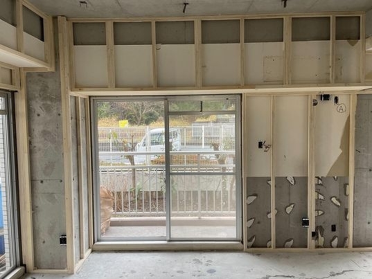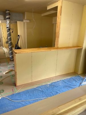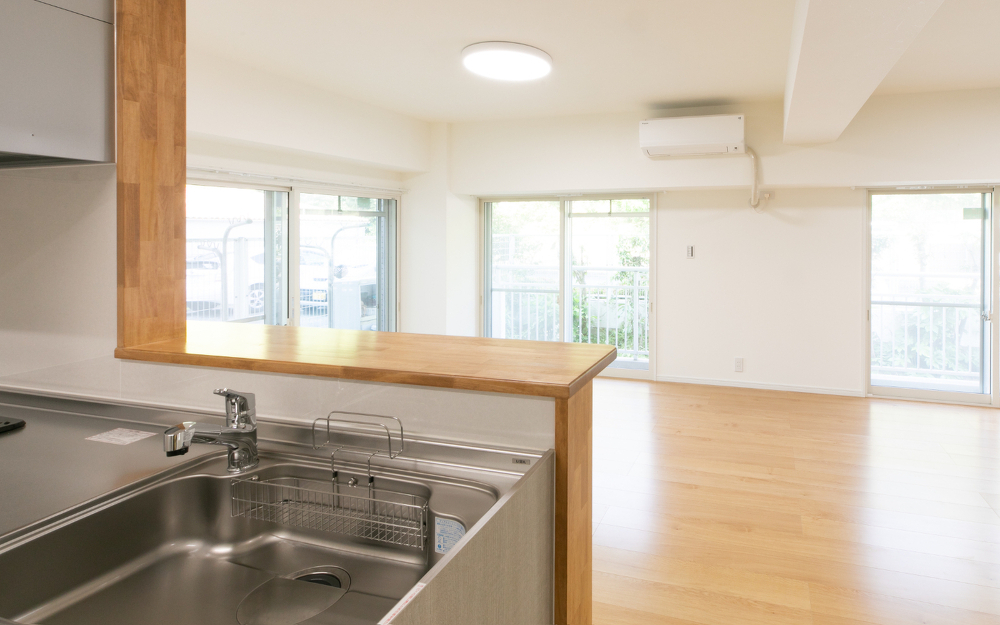 部屋の壁もはがし、広く感じれるような空間つくりに変化しました。キッチンも最新のキッチンに